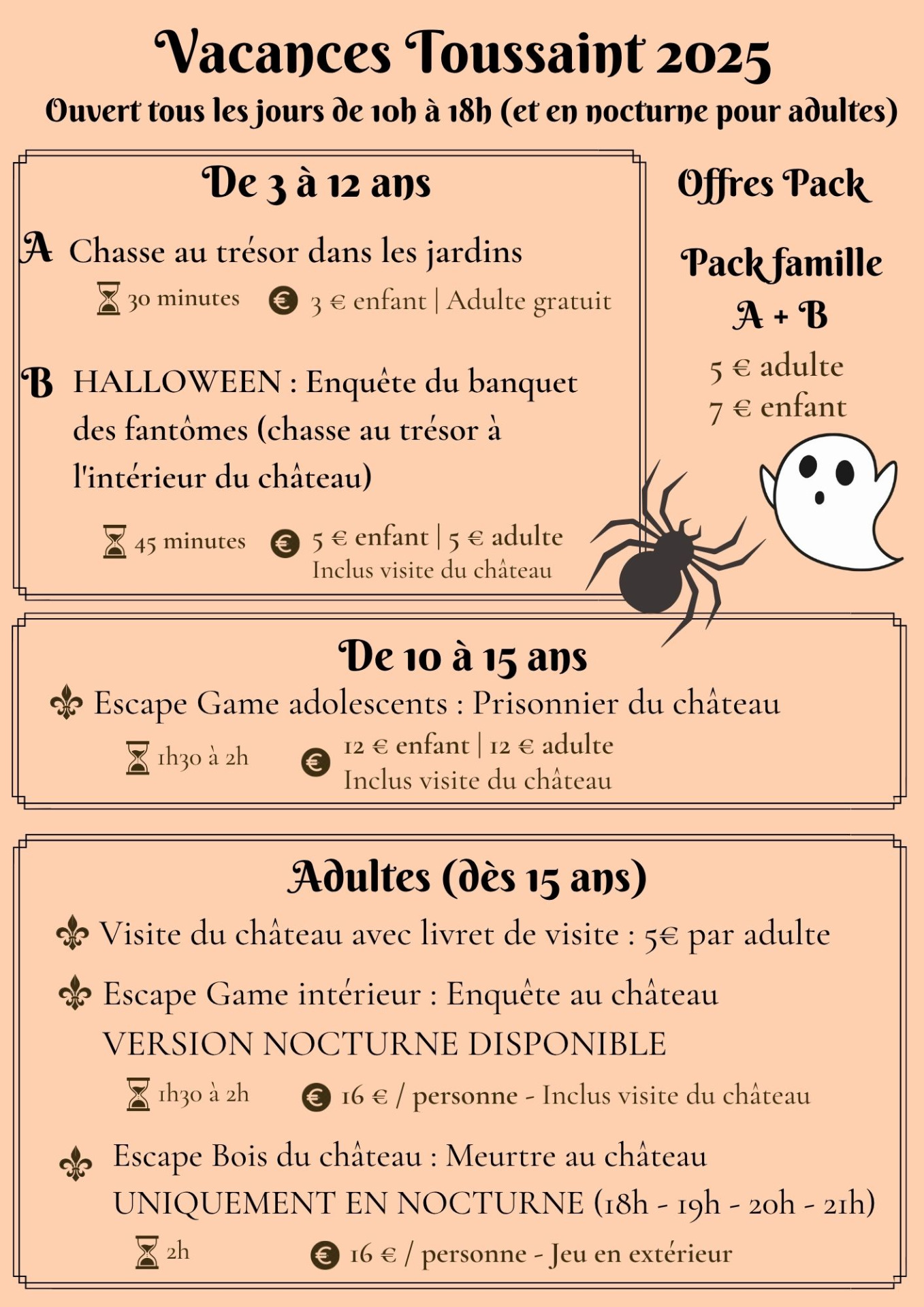 Tarifs : 9€ par enfant et 9€ par adulte - 8 personnes maximum